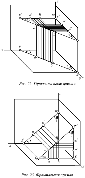 У фронтальной прямой (рис. 23) проекции аb || x и a˝b˝ || z, т. е. они перпендикулярны оси у, а потому в этом случае фронтальная проекция а́b́ прямой может занимать произвольное положение.