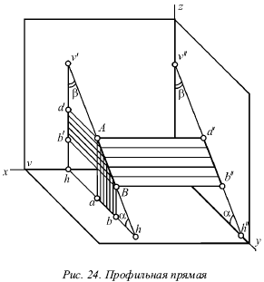 У профильной прямой (рис. 24) аb || у, а́b || z, и обе они перпендикулярны оси х. Проекция а˝b˝ может располагаться на эпюре любым образом.