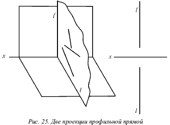 Две проекции не могут определить прямую. Две проекции 1 и 1́ профильной прямой (рис. 25) без уточнения на них проекций двух точек этой прямой не определят положения данной прямой в пространстве.