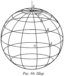 Точки пересечения поверхности шара с осью вращения (Е и F, рис. 65) принято называть полюсами.