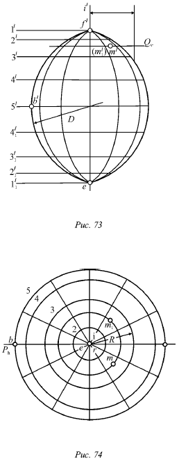 Шаровую поверхность можно получить вращением окружности около ее диаметра. Пусть ось вращения I является перпендикулярной горизонтальной плоскости и становится одним из диаметров окружности. Окружность будет вращаться около оси I и описывать шаровую поверхность (рис. 66). Точки, которые лежат на этой исходной окружности (А, В, С и D), при вращении ее вокруг оси I также опишут окружности, называемые параллелями. Параллели изображаются без искажения на горизонтальной плоскости, а на фронтальной плоскости – в виде отрезков, равных диаметрам (рис. 70).