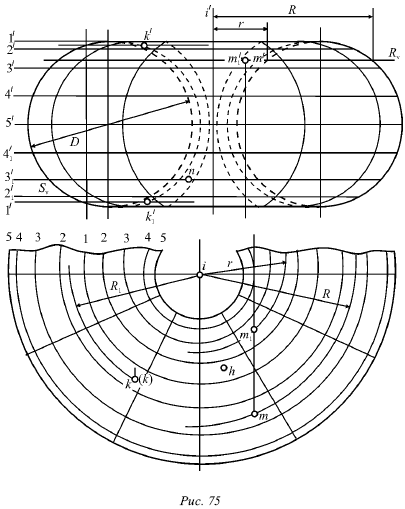 Точка В при вращении описывает самую большую окружность (ее можно назвать экватором тора). Эта окружность отделяет видимую часть поверхности тора от невидимой, если смотреть на тор сверху. Дуги окружности BAF или BF (рис. 75) описывают при вращении видимые части поверхности, а дуги ВСЕ или BE – невидимые.