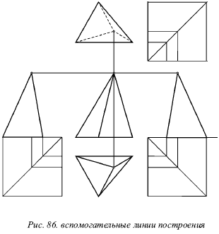 Все рассмотренные проекции предмета обычно получаются с помощью данных двух ее видов. На рисунке 86 показано построение по данным двум проекциям треугольной пирамиды еще трех ее проекций (всех, кроме вида сзади).