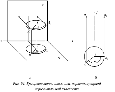 На рисунке 91 дана ось вращения I, которая перпендикулярна горизонтальной плоскости, и произвольно расположенная в пространстве точка А. При вращении около оси I эта точка описывает окружность, плоскость которой перпендикулярна оси I. А отсюда следует, что она параллельна горизонтальной плоскости, поэтому на горизонтальную плоскость эта окружность А проецируется без искажения.