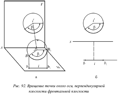 На рисунке 92 показана ось вращения I, перпендикулярная фронтальной плоскости. Можно сказать, что в этом случае горизонтальная и фронтальная плоскости поменялись ролями. Окружность здесь представляет траекторию точки В. При этом вращении она проецируется без искажения на фронтальную плоскость. На горизонтальной плоскости ее проекция b перемещается по прямой, параллельной оси х.