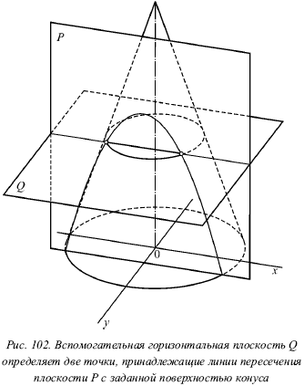 Как правило, кривая линия, полученная в сечении данного тела плоскостью, относится к лекальным кривым. Значит, для точного ее построения необходимо довольно много точек. Чтобы найти точки кривой, применяют метод проведения вспомогательных плоскостей. На рисунке 102 изображен конус, поверхность которого пересекается некоторой фронтальной плоскостью Р. Для получения нескольких точек, которые принадлежат линии сечения (гиперболе), нужно провести вспомогательную горизонтальную плоскость Q. Данная плоскость будет пересекать конус по окружности, а плоскость Р – по прямой линии. Точки, в которых полученная прямая пересекает окружность, принадлежат искомой линии пересечения.