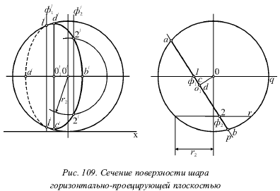 На рисунке 109 показано пересечение поверхности шара горизонтально‑проектирующей плоскостью Р. На горизонтальную плоскость сечение будет проецироваться в виде отрезка проекции р плоскости Р, который заключён между контуром шара и равен диаметру окружности сечения. На фронтальной плоскости мы получим эллипс. О 1 является центром окружности, который получен в сечении шара. Он расположен на одной высоте с центром шара О. Горизонтальная проекция о 1 центра О 1 окружности располагается посредине отрезка ab. Перпендикуляр, который опущен из точки о на прямую ab, попадает в точку о 1, являющуюся горизонтальной проекцией центра окружности сечения. Фронтальная проекция о́ 1центра окружности является центром интересующего нас эллипса.