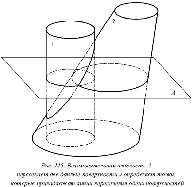 Метод проведения вспомогательных плоскостей применяется при построении линии пересечения поверхностей двух тел вращения. Суть этого метода заключается в следующем. Проводят вспомогательную плоскость А (рис. 115) таким образом, чтобы каждое из данных тел она пересекала по такой линии, построение которой не является сложным. Строят данные две линии, по которым вспомогательная плоскость пересекает поверхность каждого из тел, а точки пересечения этих линий относятся к искомой линии пересечения данных поверхностей. Следовательно, важно подобающим образом провести вспомогательную плоскость.