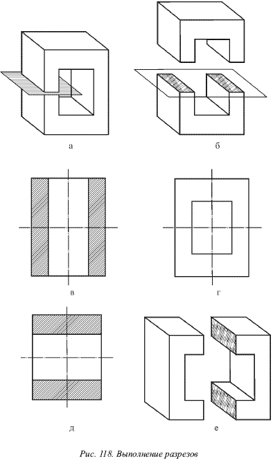 Вертикальные разрезы следует располагать соответственно на месте главного вида, вида слева и вида справа, а горизонтальные разрезы – на месте вида сверху и вида снизу (рис. 118).