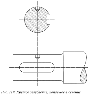 Сочетание сечения с разрезом. В случае если при выполнении сечения в секущую плоскость попадает цилиндрическое, коническое, шаровое и подобное круглое отверстие или углубление, то контур отверстия или углубления вычерчивается по типу разреза (рис. 119).