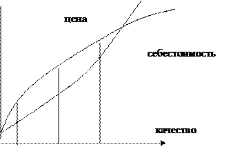 Точка 1 фиксирует наибольшее отдаление кривых и получение наибольшей прибыли. Можно остановиться на качестве 2 – производство продукции очень высокого качества, пожертвовав собственной прибылью, либо решиться принять продукцию с качеством 3 –невысоким качеством, но низкой себестоимостью и ценой. Покупатель выберет конкурентоспособную продукцию – когда качество соответствует цене – точка 1.