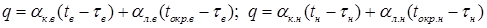 Рассмотрим стенку, отделяющую помещение с температурой tв от наружной среды с температурой tн. Наружная поверхность путем конвекции обменивается теплотой с наружным воздухом, а лучистой - с окружающими поверхностями, имеющими температуру tокр. н. То же самое и с внутренней стороны. Можно записать, что тепловой поток с плотностью q, Вт/м2, проходящий сквозь стену, равен