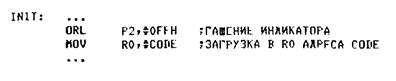 Приведенный фрагмент программы рассчитан на то, что гашение ССИ осуществляется при инициализации системы. Одновременно с этим в регистре R0 формируется адрес ячейки CODE, в которой хранится двоичный код индицируемого символа: