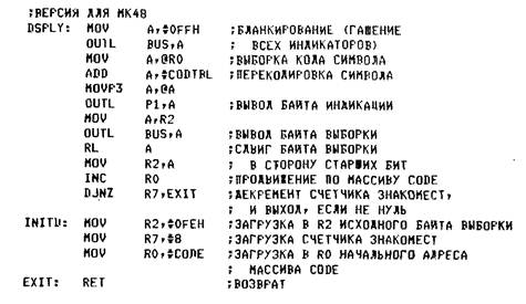 Входными параметрами для подпрограммы DSPLY являются исходный код отображаемого символа и номер знакоместа, на которое осуществляется вывод. Исходный код символа задается текущим адресом в массиве CODE (регистр R0), а номер знакоместа — текущим значением байта выборки (регистр R2) и значением счетчика знакомест (регистр R7):