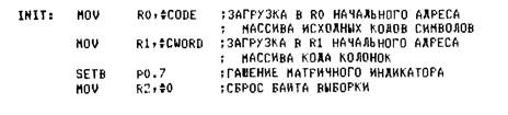 Перекодировка. Представление исходного двоичного кода символа в виде последовательности кодов колонок осуществляется таблично. Каждому символу в таблице CODTBL соответствует пять ячеек. Адрес первого кода колонки (КК) для символа формируется как CODTBL + + 5 х (двоичный код символа):