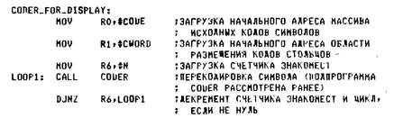 Отображение. Частная процедура отображения символа реализуется на основе параметризуемой подпрограммы индикации текущего столбца. Подпрограмма строится по тому же принципу, что и рассмотренная ранее подпрограмма отображения символа на текущем знакоместе линейного дисплея на основе ССИ. Отличием подпрограммы COLUMN является то, что блок перекодировки вынесен в самостоятельную процедуру, а формирование нового байта выборки осуществляется не сдвигом, а инкрементом регистра. Входными параметрами для подпрограммы являются: номер колонки (регистр R2), текущий адрес кода колонки (КК) в массиве CWORD (регистр R1) и текущее значение счетчика колонок (регистр R7):