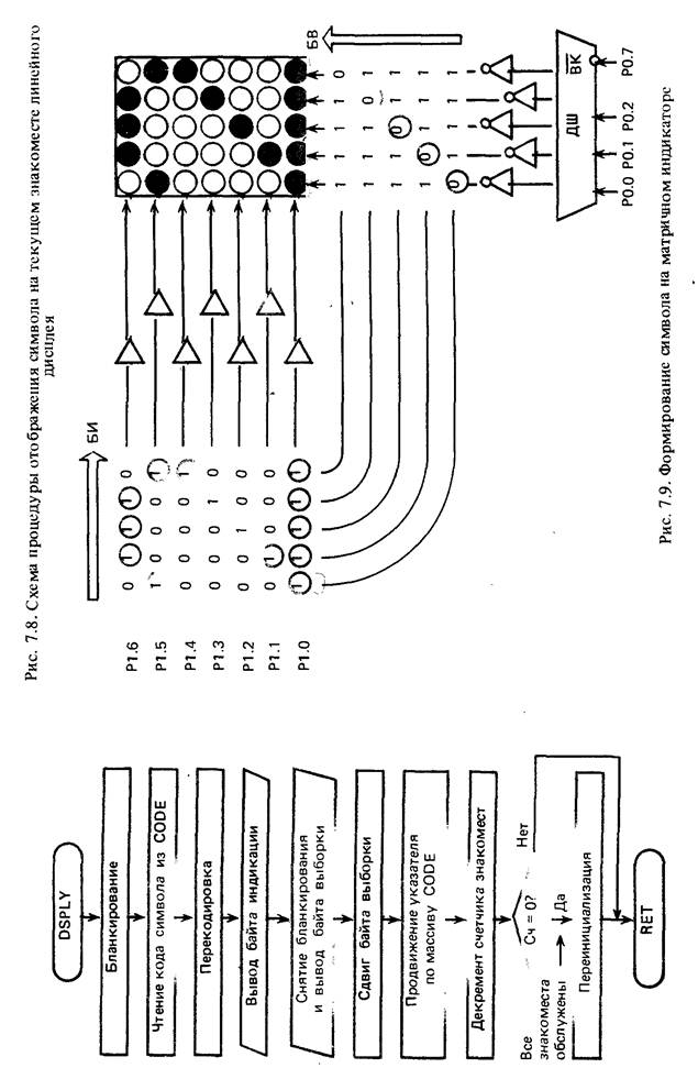 индикатор обычно используется принцип динамической индикации по колонкам. Байт индикации в этом случае представляет собой код засветки светодиодов колонки, и графический образ символа "набирается" из последовательности байтов индикации путем перебора колонок (рис. 7.9). Процедуру вывода символа на МСИ целесообразно