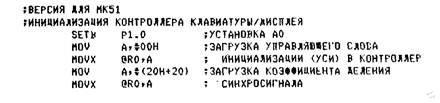 Для того чтобы настроить контроллер клавиатуры/дисплея на определенный режим работы, основная программа МК-системы должна загрузить в него управляющие слова инициализации (УСИ) и в требуемый момент выдать управляющее слово операции (УСО). Ниже приводится программа инициализации, которая настраивает контроллер на режим работы с восьмипозиционным дисплеем, распознавания одиночного нажатия клавиш и сканирования знакомест дисплея счетчиком: