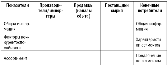 А теперь подробнее остановимся на той информации, которую будет собирать ваш маркетолог или сотрудники отдела маркетинга. Помните, что это лишь общие рекомендации. Конечный набор сведений определяет руководитель компании и менеджеры, которые на ее основе принимают решения. Только не забывайте, что сбор и обработка данных требуют времени, а часто стоят денег, и если вам необходима более детальная информация, согласуйте с вашим отделом маркетинга те ресурсы, которые понадобятся для ее получения.