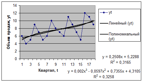 Например. Для предыдущего примера построим график временного ряда с помощью «Мастера диаграмм» и добавим линию тренда.