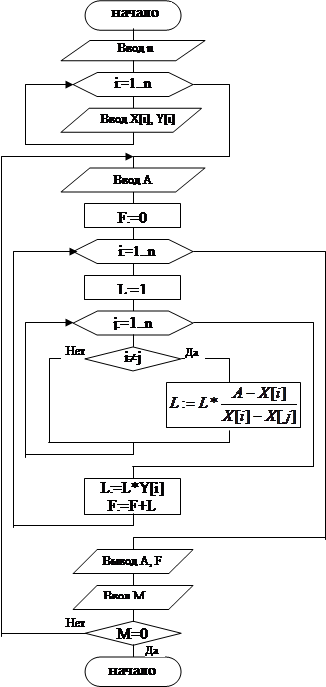 Блок-схема составления интерполяционного многочлена Лагранжа:
