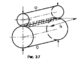 До приложения нагрузки контакт будет по линии длиной lk (рис. 3.7). Но так как тела упругие, то в результате приложения нагрузки Q образуется узкая полоска (пунктир). В сечении торцовой плоскостью цилиндров получим следующую картину (рис. 3.8). В зоне контакта возникают напряжения сжатия. Они меняются по эллиптическому закону, описанному решением Герца – Беляева: