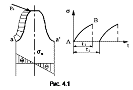 Усилие Pn занимает различное положение на рабочей части профилязуба AB (рис. 4.1). Наиболее опасное сечение будет aa '. В опасном сечении возникают изгибные напряжения. Пусть время нахождения зуба в зацеплении - t 1. Через время t 2 этот зуб снова войдёт в зацепление. Значит, напряжения изгиба в опасном сечении меняются циклически. Через определённое число циклов в переходной кривой у ножки зуба появляется усталостная трещина. Когда зуб входит в зацепление, она раскрывается, когда выходит – закрывается. Постепенно трещина развивается и происходит излом. Критерием прочности в этом случае являются изгибные напряжения, по которым необходимо производить расчёт. Для повышения изгибной прочности нужно применять материалы с высокими механическими свойствами, увеличивать радиус переходной кривой, обрабатывать переходную кривую.
