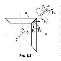 Усилия в зацеплении рассмотрим на примере конической прямозубой передачи. Условно считаем, что все силы приложены в середине зуба на диаметрах dm1 и dm2 (см. рис. 8.3). В сечении плоскостью “ n-n ” нормальной поверхности зуба действует полное усилие Fn, которое раскладывается на окружное усилие Ft и усилие Fr'. В свою очередь усилие Fr' во фронтальной плоскости раскладывается на Fa (осевое усилие) и Fr (радиальное усилие). Для определения всех сил исходной является
