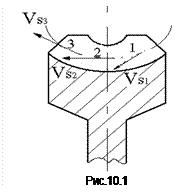 Так, в точке 2 (рис. 10.1) скорость скольжения VS2 параллельна линии контакта, поэтому отсутствует гидродинамический эффект, масляная плёнка в этой точке разрывается и имеет место сухое или ограниченное трение. В зубчатых передачах такого нет, так как скорость скольжения перпендикулярна линии контакта (прямозубые передачи) или почти перпендикулярна (косозубые передачи).