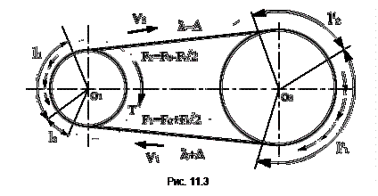 Выделим некоторый участок ремня длиной l в ненагруженной передаче, а затем дадим нагрузку. При прохождении ведущей ветви отмеченный участок удлинится l+∆, а ведомой сократится l-∆, тогда окружные скорости будут