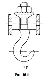 Примером может служить подвеска крюка подъемного крана (рис. 18.1). Такие соединения способны воспринимать только статическую нагрузку. Опасным будет сечение, ослабленное резьбой. Статическая прочность стержня с резьбой выше (в среднем на 10%), чем гладкого стержня с диаметром, равным внутреннему диаметру d 1. Поэтому за расчетный диаметр dp принимают диаметр больше d 1, а именно
