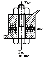 Примером может служить болт для крепления герметичных крышек и люков корпусов (рис. 18.2). В этом случае стержень болта растягивается осевой силой F зат и закручивается моментом сил трения в резьбе Тр. Момент трения на торце гайки через стержень винта не передается.