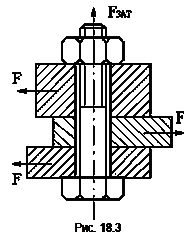 1. Болт поставлен с зазором. При этом внешнюю нагрузку F уравновешивают силами трения в стыке, которое образуется в стыке от затяжки болта (рис 18.3).
