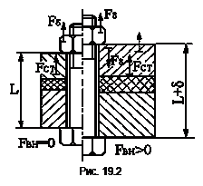 На рисунке 19.2 показана расчетная модель болтового соединения деталей Ф 1 и Ф 2 с прокладкой. Слева показано соединение при Fвн=0. В этом случае Fб=Fст=Fзат. При приложении внешней нагрузки (Fвн>0) в направлении указанном на рисунке справа, уменьшается деформация сжатия прокладки и зоны фланцев деталей, расположенных у прокладки, но т.к. усилие затяжки не изменилось, значит уменьшилось усилие на стыке, т.е.