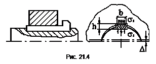 Для упрощения расчета клиновых врезных шпонок принимают, что при передаче шпоночным соединением крутящего момента Т напряжения сжатия по ширине поверхности контакта рабочих граней шпонки с валом и ступицей распределяются по закону треугольника. В этом случае передаваемый крутящий момент Т складывается из момента нормальной силы Fn (рис. 21.5), момента сил трения между ступицей и шпонкой