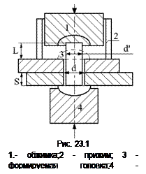 Соединение собирают путем установки заклепок в предварительно подготовленные отверстия в деталях и последующей осадки клепки специальным инструментом второй замыкающей головки (рис. 23.1).