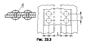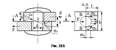 Принимают, что нагрузка равномерно распределяется между всеми одиночными соединениями. В нахлесточных и стыковых соединениях с одной накладкой, называемых односрезными, заклепки работают на срез и изгиб из-за несовпадения плоскостей действия сил F, то есть под действием момента M= F a (рис. 23.5). Момент возрастает с увеличением толщины листов; он воспринимается стержнем и головками заклепки, вызывая их деформации (сдвиг и изгиб). В результате контактные напряжения sk между листами и стержнем заклепки, уравновешивающие силы F, будут неравномерно распределяться по высоте заклепки и в окружном направлении, концентрируясь вблизи стыка листов.
