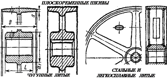 Шкивы плоскоременных передач имеют: обод, несущий ремень, ступицу, сажаемую на вал и спицы или диск, соединяющий обод и ступицу.