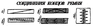 Соединение концов ремней оказывает большое влияние на работу передачи, особенно при больших скоростях. Выбирая тип соединения следует учитывать рекомендации специальной литературы. Самый совершенный способ соединения – склеивание, которое производят для однородных ремней по косому срезу (а), для слоёных по ступенчатой поверхности (б). Надёжным способом считают сшивку встык жильными струнами (в,г). Из механических соединений лучшими являются проволочные спирали, которые продеваются в отверстия и после прессования обжимают концы ремней (д).
