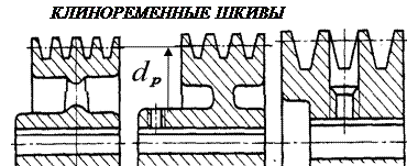 У шкивов клиноременных передач рабочей поверхностью являются боковые стороны клиновых канавок. Диаметр, по которому определяют расчётную длину ремня, называют расчётным диаметром, по ГОСТ 20898-75 он обозначается dp. По этому же ГОСТу для правильного контакта ремня со шкивом угол канавки назначают в зависимости от диаметра шкива.