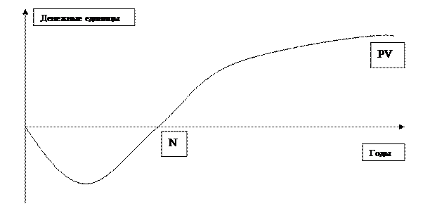 Простым сроком окупаемости (N) называется период за который величина накопленного дохода равно 0 или чистый накопленный доход равен сумме первоначальных инвестиций. Срок окупаемости (рис.4) показывает, что инвестиционные затраты полностью окупились и проект начинает приносить прибыль. Пример, общий случай: