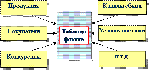 Хранилище построено по схеме «звезда». Все «качественные» (неколичественные) характеристики объектов анализа собираются в справочниках, все количественные характеристики – в Таблице фактов (рис. 9.2)
