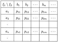 где a 1, a 2, …, an … — значения случайной величины x 1; b 1, b 2, …, bn, … — значения случайной величины x 2; a pij = P (x 1 = ai, x 2 = bj) — совместные вероятности значений (x 1, x 2).