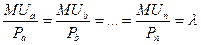 Условие равновесия потребителя определяется вторым законом Госсена: функция полезности максимальна в том случае, когда денежный доход распределяется таким образом, что каждый последний рубль затраченный на покупку товара приносит одинаковую предельную полезность:
