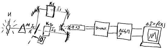 И - источник света (ксеноновая лампа, лазер); М - монохроматор (монохроматор состоит из дисперсионных призм и дифракционных решеток); К1 и К2 - кюветы с контрольным и исследуемым растворами; О - Обтюратор (затвор) - сектор с двумя вырезами, в которых пучок расщепляется попеременно на два пучка света, один вначале поступает в 1-ую кювету, а затем во вторую (до 50 сигналов/с), попеременно их регистрирует ФЭУ и после усиления и преобразования в АЦП их подают в ПЭВМ, где обрабатывает отношение сигнала