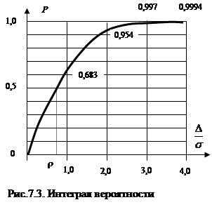 где z=D/s, Ф(z1) – интеграл вероятности, обычно определяемый по таблицам. На рис. 7.3. показана зависимость интеграла вероятности от соотношения между текущей погрешностью D и ее средним квадратическим значением s. Погрешность, интеграл вероятности которой равен 0,5 называют вероятной погрешностью r. Для этой погрешности характерно то, что при повторных измерениях примерно в половине случаев фактическая погрешность будет меньше r, а в другой половине случаев – больше или равна r. Значение вероятной ошибки r =0,6745 s. Из рис.7.3. видно, что по мере роста аргумента D/s интеграл вероятности быстро приближается к единице. Другими словами, по мере расширения доверительного интервала вероятность того, что случайная погрешность не превысит этот интервал, быстро падает. Так, вероятность того, что погрешность измерения не превысит 2 s, равна 0,954. То есть из тысячи измерений только в 46 случаях погрешность превысит 2 s. Аналогично, только в 3-х случаях погрешность превысит 3 s. Такое событие можно считать весьма маловероятным. Доверительная погрешность, равная 3 s, называется граничной. Если в ряду измерений встречают погрешность D> 3 s, то такое измерение полагают промахом и в дальнейшей обработке результатов измерений не учитывают. Этот критерий известен как “ правило 3s “. В теории вероятностей и математической статистике находит применение также термин “ а%-ный квантиль” – такая абсцисса функции распределения плотности вероятности, слева от которой находится а% площади под графиком этой функции. Другими словами, вероятность Ра% того, что случайная погрешность D < Dа%, равна а%. Интерквантильным промежутком называют разность между а%-ным и (100 - а)%-ным квантилями.