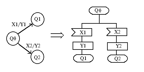 Состояние здесь всегда ожидание без действий, переходы происходят при приеме ожидаемых сигналов, действия (выдача сигналов, процедуры или арифметические вычисления) выполняются во время перехода. Эквивалентное преобразование традиционной КА-диаграммы в схему SDL-процесса показано на рис. 9-2.