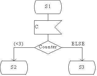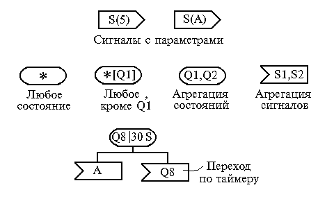 Для большей выразительности и лаконичности языка набор основных элементов расширен; некоторые расширения показаны на рис. 9-3. Таким образом, процессы – это КА, обменивающиеся сигналами (см. рис. 9-5, а). Сигналы могут передавать параметры – константы и переменные. Переменные могут хранить предысторию и влиять на переходы (моделирование предикатов): на рис. 9-4 показано разветвление перехода в зависимости от условия Counter < 3.