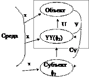 субъект ощущает на себе воздействие среды Х и объекта У. Если состояние среды Х он изменить не может, то состоянием объекта У он может управлять с помощью специально организованного воздействия U. Это и есть управление.