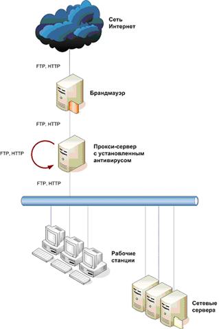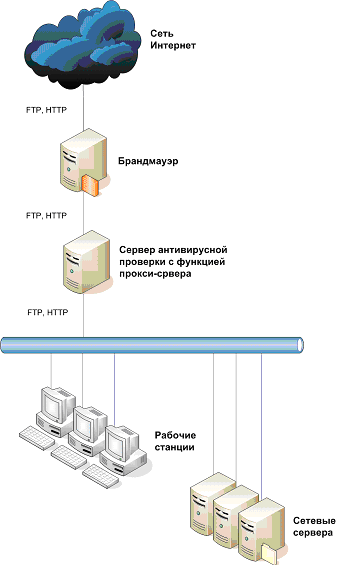 При проверке протоколов Интернет, сервер антивирусной проверки наиболее оптимально устанавливать перед прокси-сервером, но за брандмауэром, если смотреть со стороны защищаемой сети. Впрочем, брандмауэр может и отсутствовать. В этом случае антивирус получает на вход тот же поток, который до этого получал прокси-сервер, выполняет проверку поступающих данных на наличие вредоносного кода и передает уже проверенные данные на прокси-сервер.